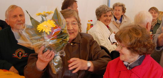 Mellunhirven 40v -pihajuhlissa 27.8.2008 kukitettiin taloyhtiön alkuperäisasukkaat. Kuvassa oleva Emma Leinonen asuu edelleen Mellunhirvessä.